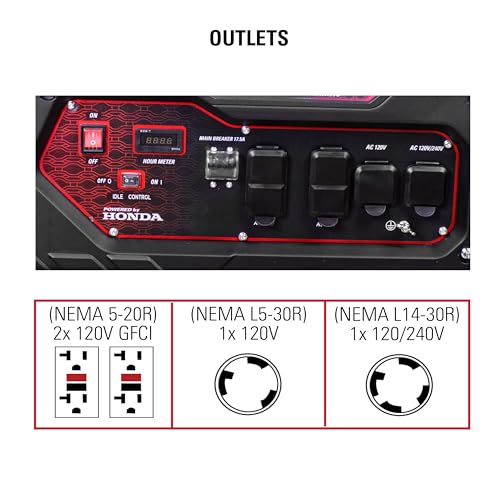 Keep watch over Panel & Outlets: The easy get right of entry to Keep watch over panel features a run-time indicator and six (6) outlets with waterproof covers – One (1) 120-Volt locking; Four (4) 120-Volt household with GFCI Protection; One (1) 120/240 locking; 17-hour run time at 25% load