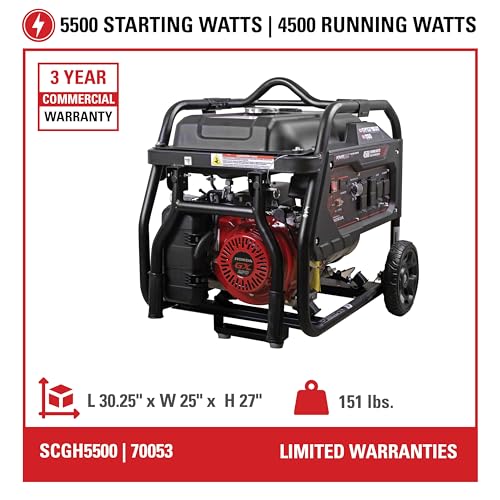 Specification: SIMPSON Cleaning SCGH5500 Industrial Gas Generator and Power Station for Construction, Jobsite, Commercial, Camping, Tailgating, 4500 Running Watts 5500 Starting Watts (50-State)