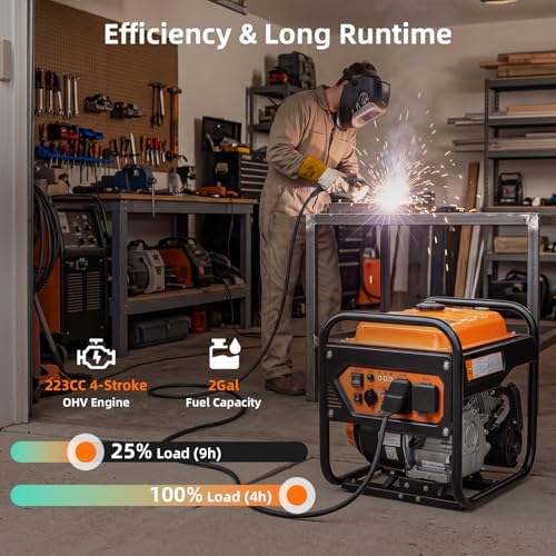 - 𝟲 𝗛𝗼𝘂𝗿𝘀 𝗥𝘂𝗻𝘁𝗶𝗺𝗲 𝗮𝘁 𝟱𝟬% 𝗟𝗼𝗮𝗱: Runs up to 6 hours at 50% load on a 2-gallon fuel tank. ECO mode automatically adjusts engine speed based on demand to help improve fuel efficiency. Built-in fuel gauge allows easy monitoring of fuel levels during operation.