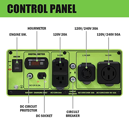 The unit features two 120V/20A, NEMA 5-20R AC outlets, one 120V/240V/30A Twist-Lock, NEMA L14-30R and one 120V/240V/50A RV able TT-50A all of which might be weather-covered. This unit features 10″ solid wheels and foldable pull handles which make moving the generator a breeze.