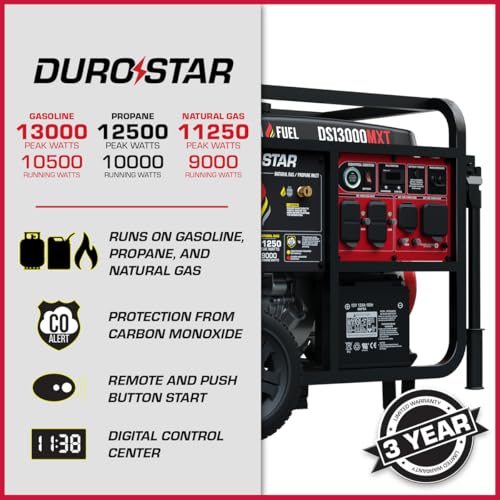 DuroStar DS13000MXT 13,000-Watt 500cc Tri Fuel Portable Generator – Gas, Propane & Natural Gas, Remote Electric Start, Whole Home Power Backup, Transfer Switch Ready, RV & Emergency Ready