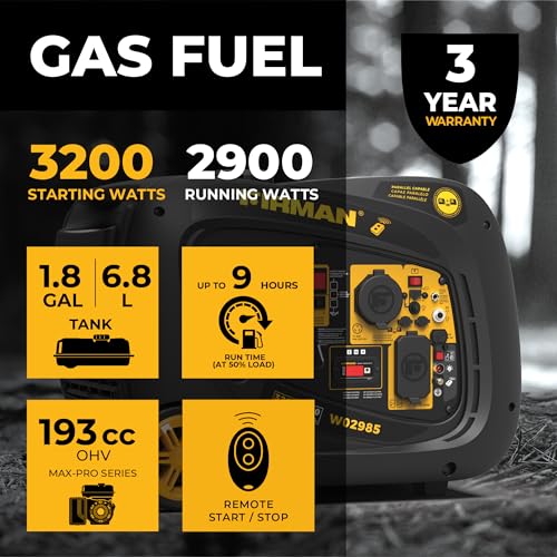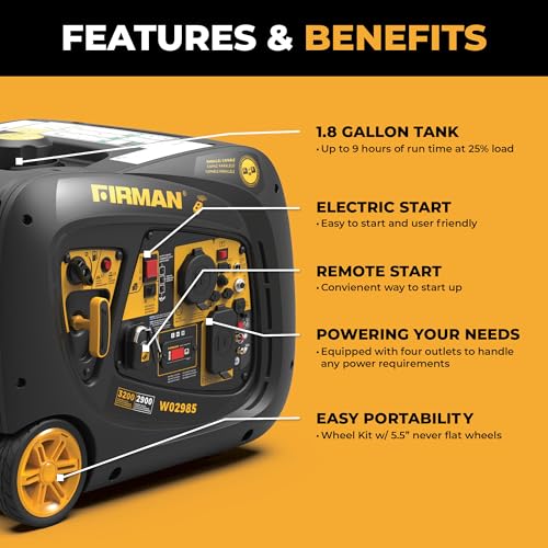 Specification: FIRMAN W02985 Inverter Portable Generator 3200W Remote Start, RV Ready Quiet Gas Power Station, Portable Outdoor Generator for Camping, Tailgating, Home Backup, Emergency Use