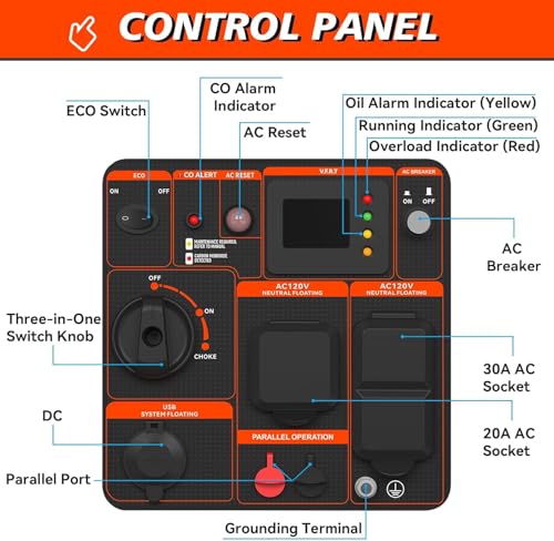 Safety First, Always : This power generator’s got your back—2 covered 120V receptacles, USB-A & USB-C for gadgets, CO shut-off, and warning lights. Less stress, more power, and peace of mind.