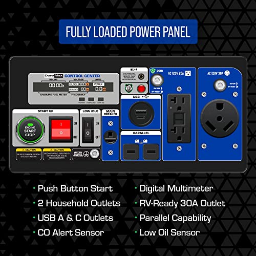 Specification: DuroMax XP4500iH 4500-Watt 223cc Dual Fuel Digital Inverter Hybrid Portable Generator, Black/Blue