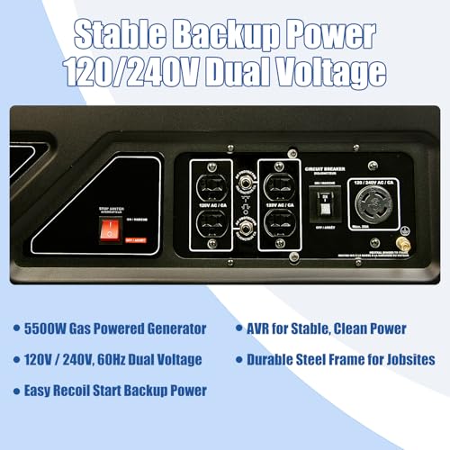 TOOLCY 5500W Gas Powered Generator – High-Performance Gas Generator with AVR, Steel Frame for Backup Power, Jobsite & Outdoor Use, 120V/240V 60Hz, Recoil Start, Not for Sale in California