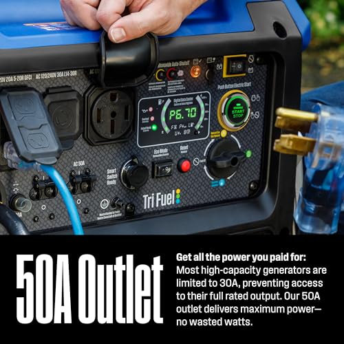 THE BEST OF BOTH WORLDS: The Westinghouse iGen11000TFc is a tri fuel generator with the entire benefits of an inverter, but also with whole home backup power and a 50A outlet; 9000 running /11000 peak watts (gasoline); 8100 running/10000 peak watts (propane); 7200 running/8800 peak watts (natural gas)