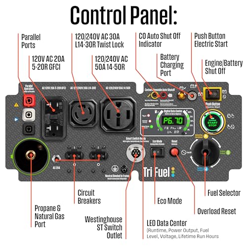 TRANSFER SWITCH OR INTERLOCK KIT READY: Features one 120/240V 14–50R 50A outlet for home or RV and one 120V/240 L14-30R 30A twist lock, both outlets are transfer switch or interlock kit ready for home backup; includes one GFCI 120V 5–20R 20A duplex household outlet; all have rubber covers