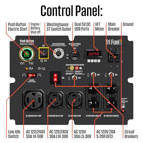TRI FUEL WESTINGHOUSE WORKHORSE: Runs up to 16 hours at 25% load on a 10.5 gallon gas tank, powered by a heavy duty 713cc Westinghouse V-Twin OHV engine; Automatic low oil shutdown; Low idle mode; VFT data center shows voltage, frequency and lifetime hours for updates on output and maintenance