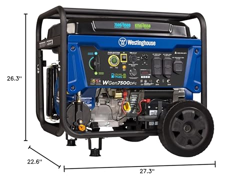 The Westinghouse WGen7500DFc Dual Fuel Portable Generator with CO Sensor is a powerful solution to staying prepared for emergency events. It produces up to 9,500 peak watts and 7,500 running watts, running for up to 11 hours on a 6.6 Gal. (25 L) gasoline fuel tank. Forged with a cast iron sleeve, the WGen7500DFc has a 420cc 4-Stroke OHV Westinghouse Engine constructed for durability. It is equipped with a built-in fuel gauge, automatic low oil shutdown, and GFCI household outlets for added protection. The WGen7500DFc features Push-Button Electric Start which conveniently pairs with a wireless remote key fob for effortless ignition, and as a dual fuel generator, the WGen7500DFc operates on gasoline or propane (LPG) for versatility. The L14-30R 30A outlet is Transfer Switch In a position, connecting straight to your home for total household power and getting rid of the hassle for annoying extension cords or power strips. The WGen7500DFc is easy to maintain with a VFT Data Center to share real-time updates on maintenance information, ensuring long life and lasting utility. A hardened-steel frame with added roll bars, foam grip take care of, and never-flat wheels permits you to easily transport this generator at the go. The WGen7500DFc is complete with a 3-Year Limited Warranty and Lifetime Technical Strengthen backed by our nationwide customer service and Strengthen network.