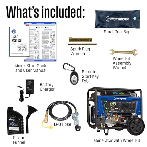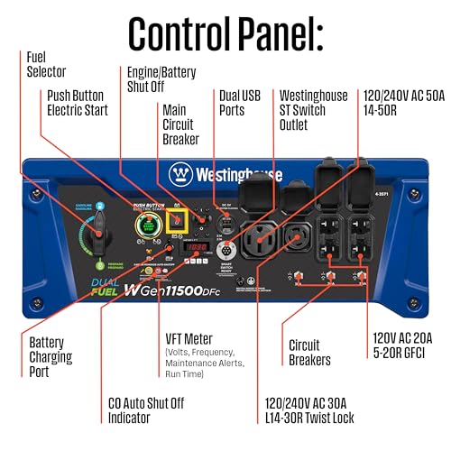 The Westinghouse WGen11500DFc Dual Fuel Portable Generator with CO Sensor produces up to 14,500 peak watts and 11,500 running watts, the WGen11500DFc is a dual fuel generator that operates on gasoline, propane (LPG), or natural gas. The heavy duty 550cc 4-Stroke OHV Westinghouse Engine is constructed of a durable cast iron sleeve and runs for up to 19 hours on a 9.5 gallon (36 L) gas tank, keeping you powered through the day with built-in fuel gauge, automatic low oil shutdown, and GFCI outlets. Push-Button Electric Start makes starting the WGen11500DFc effortless even as the remote start key fob offers added ease from a distance. Its intuitive keep an eye on panel spotlights the Transfer Switch In a position L14-30R and larger 14-50R to power your major appliances like the air conditioner, refrigerator, and sump pump in addition to any lights or entertainment centers all on the same time with a single cord hookup. VFT Data Center displays volt output, frequency, and lifetime hours to keep you up-to-the-minute with real-time information and regular maintenance. Conveniently portable with an included set of heavy duty never-flat wheels, care for, and lift bracket, it’s going to have your house, shuttle trailer, or jobsite powered in seconds. The WGen11500DFc is complete with a 3-Year Limited Warranty and Lifetime Technical Improve backed by our nationwide customer service and Improve network.