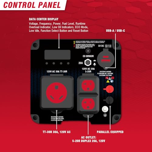 Built-in safety and expandability: With our built in CO sensor this unit is equipped with automatic shutdown for safety, low oil protection, and a digital data center for real-time monitoring. Parallel-able ports make it easy to connect a second generator if you want more power down the road.