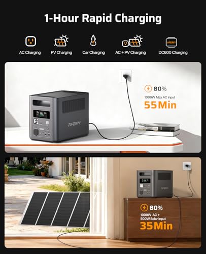【4000+ Cycles & High-Speed Solar Lifespan】Featuring a long-life LiFePO4 battery (1800W/1024Wh) for 4000+ cycles and up to 10 years of service. Paired with the AFERIY 400W portable solar panel (23% conversion rate), it enables exceptionally fast solar recharge, reducing grid dependency. This system offers unmatched long-term value for home backup, off-grid living, and demanding outdoor use. Note: Components ship separately.