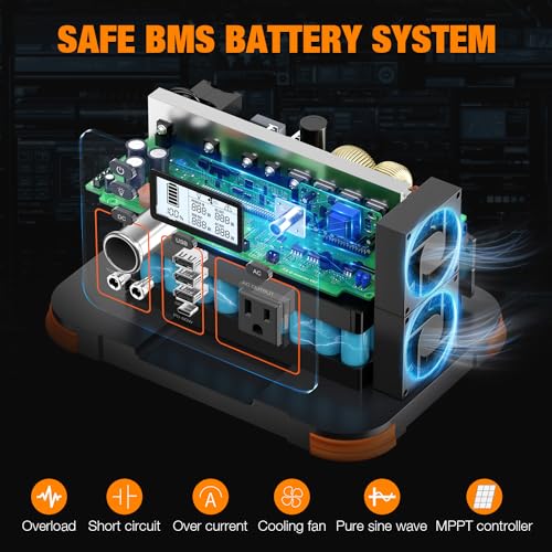 【UPGRADED BATTERY MANAGEMENT SYSTEM】We are committed to high-quality lithium batteries because we have found that using low-quality batteries can be a serious threat to life and should be a key part of deciding what to buy. The upgraded BMS provides built-in overload, overcharge (automatically stops charging when the device is fully charged) and short circuit protection. Dual built-in silent cooling fans help keep the power station at a safe temperature.