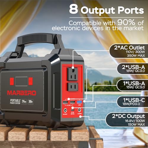 Specification: MARBERO Portable Power Station 296Wh Camping Solar Generator Laptop Charger Power Bank with AC Outlet 110V 350W Peak with Multi-Port LED Flashlights for CPAP Home Camping Hurricane Emergency