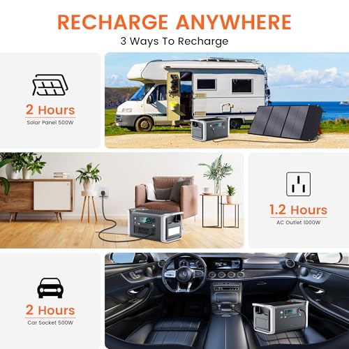 [1.2 Hours Fast Charging]: With 1000W AC input, fully recharge in 1.2 hours. Solar charging reaches 100% in 2 hr at 500W XT60 input. You can also recharge your power station through the car outlet on a road trip. Always ready to go when you need it