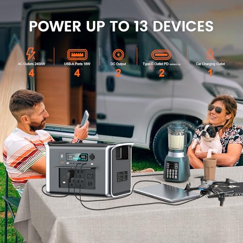 [2048Wh Capacity Power Up to 11 Devices Simultaneously]: With a rated power of 2400W, featuring 13 output ports including 4 pure sine wave AC(2400W), 4× QC3.0 USB-A (18W), 2 USB-C (PD100W&22.5W), 2 DC and car charger output, with LED lights, the Solar Generator is capable of charging multi devices simultaneously, meeting power needs in various scenarios