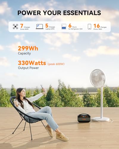 【Portable Power Station】330W and 299Wh capacity is sufficient to meet most essential recharging needs. With 9.48 lbs, it is easy to carry and perfect for providing power in off-grid life.