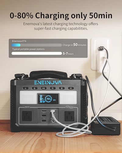 【600W Output, 288Wh Capacity】ENERNOVA generator boasts a high-capacity 600W (1100W surge) pure sine wave AC outlet and a 288Wh capacity. Its standout features include large capacity, lightweight design (8.8 pounds), compact size, and outstanding portability. It serves as the easiest companion for camping, emergencies, go back and forth, RV trips, and outside adventures.