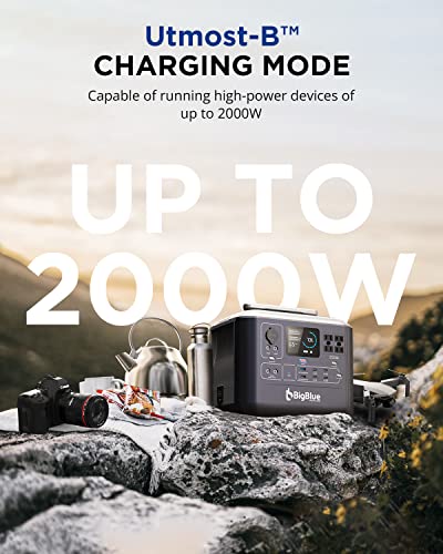 ⚡【13 Versatile Outputs Ports】Newly introduced ‘Utmost-B Charging’ mode–the capability to boost up the total output to 2000W even as charging your heavy-duty devices. PD 45W/100W USB-C and 18W USB-A can charge fast concurrently 6 devices. With an extra 4 pure sine wave AC outlets (peak 2000W) 1 car outlet and 2 DC outputs, BigBlue 1075.2Wh solar generator can keep your essential circuits running throughout an outage and overland adventures.