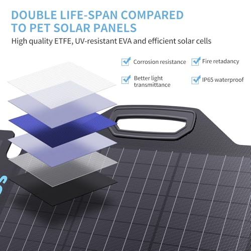 ⚡ 【Longer Life-span ETFE Panels】BigBlue 100W solar panel combines high quality ETFE, UV-resistant EVA and efficient solar cells. ETFE (Ethylene Tetrafluoroethylene) is corrosion resistance, waterproof and fire retadancy. Double life-span compared to other PET solar panels and the light transmittance is up to 95%, you’ll get the good quality and high efficiency together.