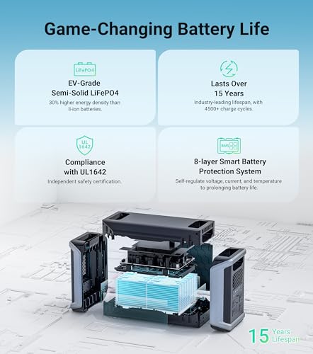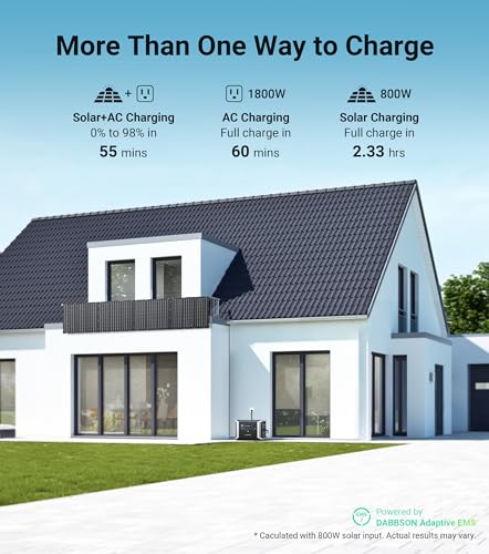 Power to Redefine Safety: Dabbsson is the first brand to use industry-leading EV semi-solid state LiFePO4 batteries and the highest fireproof rating UL94 V0 outer shell the thermal runaway is 4X higher than Li-NMC battery which is more stable in hotter temperature, the ideal choice for safe storage ever. Use and recharge DBS2300plus more than 4500 times (extra 500 with BMS system) before hitting 80%, almost 15 years of regular use.