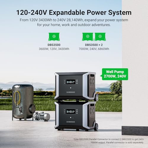 Specification: Dabbsson Solar Generator DBS-3500, Includes 1x3600W 3430Wh Portable Power Station and 2x 420W Solar Panel,Support Parallel Connection Max 28140Wh,30A AC Port,Fast 2400W Solar Input,Home Camping Backup