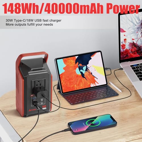 Multi-output: Armed with a 148Wh (equiv. 40,000mAh/3.7V) rechargeable battery pack, solar generator features 2x 200W(Peak 300W) AC outlets, 1x PD 30W USB C port, 1x 18W USB C port, 2x USB port(18W QC3.0) and 1x 12V DC outlet that deliver stable and secure power as you expect. It is the best choice for car tent, mobile office, hurricane emergency supplies, RV camping accessories, road trip essentials.