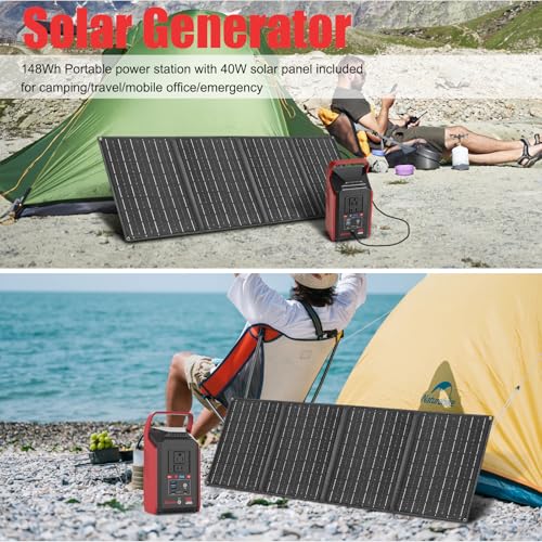 Takki Solar Generator 148Wh with 40W Solar Panel Included 300W Peak Portable Power Station Camping Power Bank with 110V AC Outlet for Home Camping Emergency Hurricane
