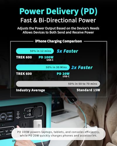 FAST, FLEXIBLE CHARGING OPTIONS – Don’t let slow charging waste your time. With USB-C PD100W, USB-A QC18W, AC outlets, and DC ports, the Trek 600 charges phones, laptops, small appliances, and more in record time. Recharge the station itself quickly via solar panels, AC, or car charging so you’re always ready for what’s next.