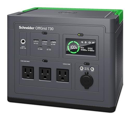 Specification: Schneider OffGrid Portable Power Station 700W, PPS730, Lightweight 738Wh Solar Generator: 3 AC Outlets, Quick Charge USB-C PD Port, Wireless Charging, LED Light for Outdoor Camping, RV, Home Backup