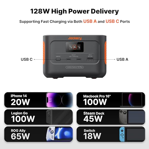 Jackery Explorer 100 Plus Power Station, 99Wh LiFePO4 Battery Power Bank, 3-Port 128W Portable Charger, PD 3.0 Fast Charge, Compatible with MacBook Pro/Air, iPhone 15/14 Series (Solar Panel Optional)