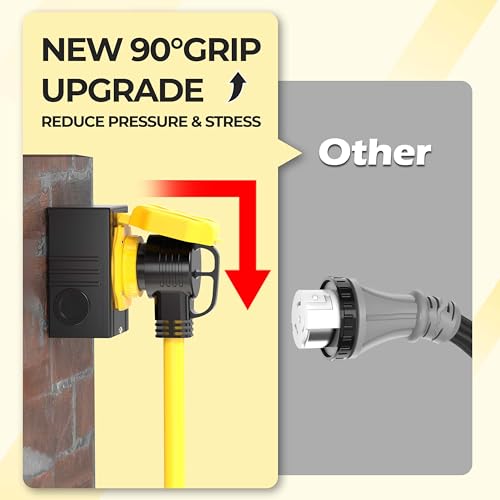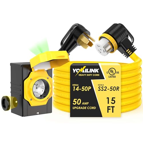 Specification: 50 Amp 15 Feet Generator Cord with Inlet Box Kit, Heavy Duty 6/3+8/1 AWG STW Wire, NEMA 14-50P to SS2-50R Twist Locking, Newly Designed 90 Degree Grip Handle for Generator to House