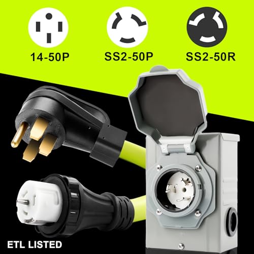 Parameter Information: Campzlly NEMA 14-50P male plug connects to the generator power socket, at the same time as the NEMA SS2-50R female receptacle connects to your NEMA SS2-50P power inlet box. It operates at 50A, 125/250V, with a maximum wattage of 12,500 Watts. It’s ETL Listed, providing an impeccable solution to make sure you are prepared for unforeseen power outages
