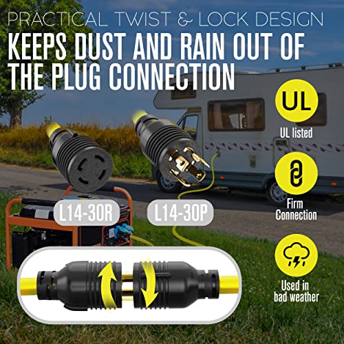 Specification: Houseables 30 Amp Generator Cord 4 Prong, Extension Generator Cable, 10 FT, 125-250v, 7500 Watt Max Rating, UL CUL, NEMA L-14-30P, Rubber, 10 Gauge, Heavy Duty, L14-30, Transfer, Twist Lock Power Cord