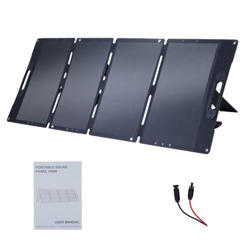 【Portable & Foldable】The 100W portable solar panel is designed for camping and outside activities, equipped with adjustable kickstands for optimal sunlight exposure. Its lightweight, four-fold design weighs just 12 pounds, and the folded size is 18.4″L x 3.2″W x 22.4″H, making it easy to transport. Note: This solar panel cannot store electricity.