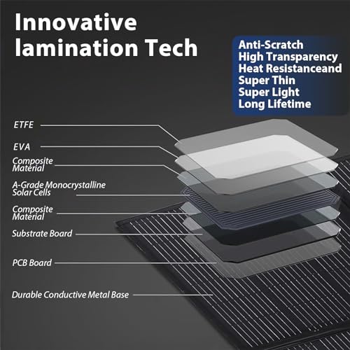 [WATERPROOF & DURABLE] Advanced ETFE laminated technology, a heat-resistant dustproof and waterproof film on the surface, prevent damage of the cells due to moisture and sun and make itmore durable, scratch-resistant, and moisture-proof. lt is lP65 waterproofwhich will protect it from water splashing, and withstand a variety of weatherconditions, making it ideal for outdoor adventure. (Do not place it under the rain, or soak it in water).