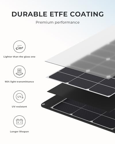 【Waterproof & Durable】 The OUKITEL 220W Solar Panel is fully waterproof due to a seamless, one-piece design, making it ideal for outdoor activities like camping and hiking. An ETFE film provides extra protection against ultraviolet light, prolonging the lifespan of the product.