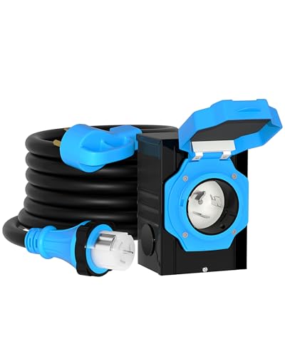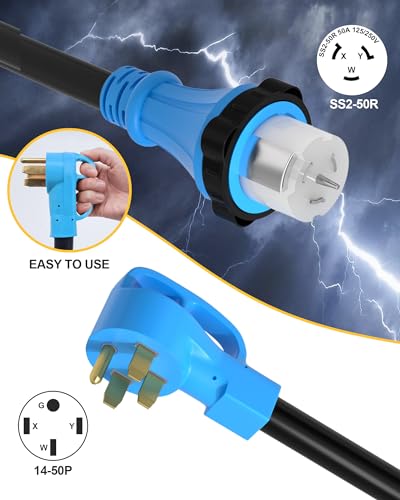 🛡️[High quality generator extension cord]: The 50AMP generator extension cord is composed of 1/8+3/6 gauge all copper cables inside, with low resistance and better conductivity. The external part is wrapped with flame-retardant polyvinyl chloride material (PVC), making it more wear-resistant, waterproof, and has a longer service life.